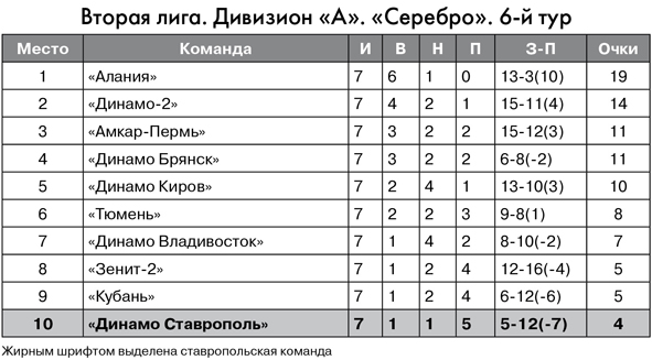 Что касается «сине-бело-золотых», то их ждет затяжное гостевое турне. 11 апреля они сыграют в Химках против дубля московского «Динамо», 18-го числа отправятся к молодежке «Зенита». 25 апреля ставропольские футболисты начнут второй круг матчей в Кирове со своими «тезками», 2 мая состоится игра в Перми с «Амкаром». И лишь 10 мая «сине-бело-золотые» дома примут «Тюмень». Возможно, эта встреча пройдет уже в Ставрополе. Верим в команду и ждем изменений. Трудное время ожидает коллектив. Впрочем, наши «динамовцы» именно в трудные моменты раньше показывали себя с лучшей стороны. Победа сейчас очень нужна, иначе команда психологически не сможет верить в себя.