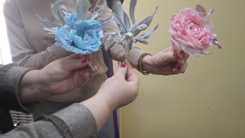 Особое место занимает совершенно уникальная текстильная выставка Елены Денисенко, уже вторая в стенах СЦБС. В этом году посетители могут увидеть как украшения, сделанные ее руками, так и картины из лент. Для них она берет сюжеты известных художников, вкладывая в работы свой талант и энергетику. Так, для одной девушки мастерица сделала картину с пионами, символами любви, и та вскоре вышла замуж.