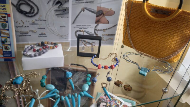 Виктория Павловна рассказала, из каких материалов сделаны ею и другими сотрудницами различные изделия: подвеска, браслетики, серьги, колье и многое другое. Они изготовлены из окаменелой раковины аммонита (вымершего головоногого моллюска), из туркменской бирюзы, амазонита, лунного камня, опала, лазурита, коралла, кошачьего глаза, аметистов, кианита, гематита, горного хрусталя. В ход пошли и сверкающие кристаллы Сваровски, и муранское стекло, дорогие жемчужины, в том числе разноцветные, и семена дерева рудракша, называемые у индусов «слёзы Шивы». В Индии они почитаются как священные, изготовленные из них бусины там носят на цепочках, вставляют в золото. Интересно, что поверхность бусин разделена глубокими бороздками, в результате получаются разные изделия, от «двуликих» до «девятиликих».