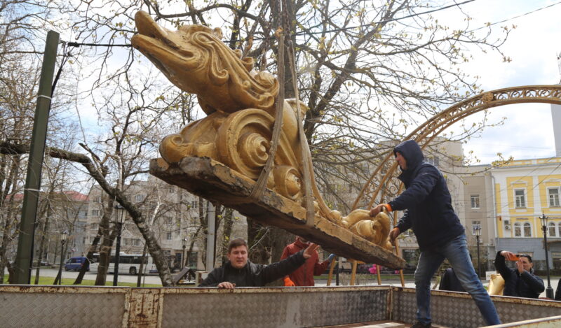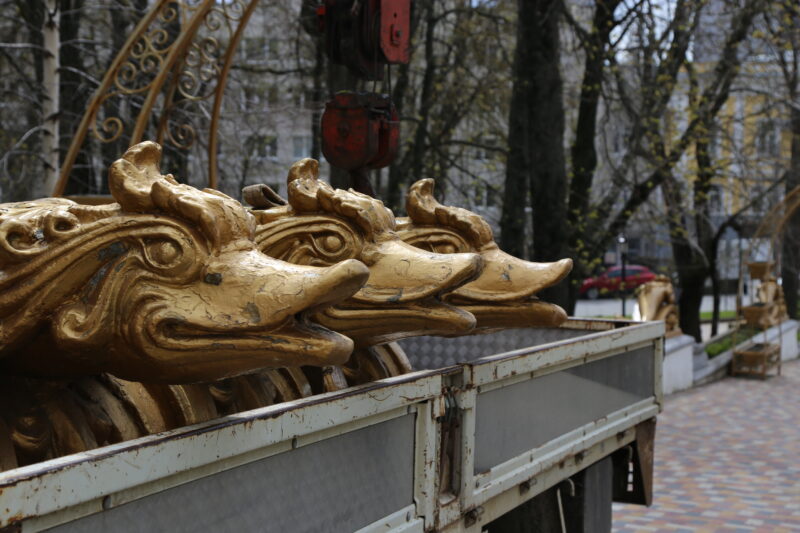 На этот раз в мастерские отвезли три скульптуры рыб и две чаши фонтана. Перед началом работ каждый элемент проходит тщательное исследование: специалисты изучают состояние материалов, степень износа и возможность восстановления. Такой подход позволяет максимально точно воссоздать оригинальный вид объекта.