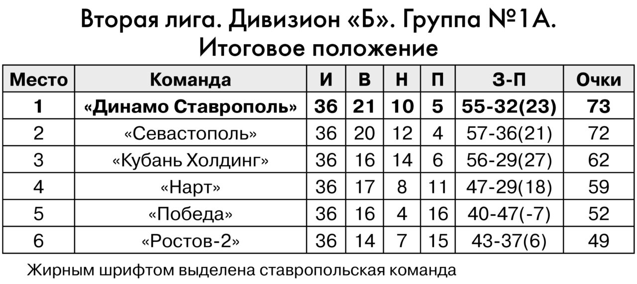 Команде, занявшей в 2024 году третье место, удалось сохранить основной костяк, укрепив свободные позиции сильными игроками с богатым опытом выступлений в соревнованиях высокого уровня. «Динамовцы» довольно долго запрягали, но затем поехали, ворвавшись в группу лидеров. Перед последним туром ставропольские футболисты находились на первом месте. Там, где и должны были быть, получив установку от руководства клуба. Правда, преимущество – минимальное. Всего одно очко от «Севастополя», который упал с пальмы первенства, забив автогол на последних секундах завершающего в этом году для крымской команды домашнего матча в сезоне против «Нарта», сведя встречу вничью. Именно с черкесским коллективом предстояло сыграть «динамовцам» в гостях в последнем туре. Для чемпионства требовалось только три очка, и полагать, что «Победа» отберет очки у «Севастополя» было бы наивно. Как можно понять из заголовка, «сине-бело-золотые» справились со своей миссией успешно.
