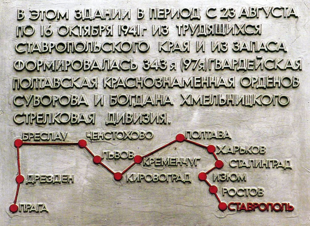 В таком же неравном бою, не желая сдаваться в плен, ставрополец Николай Крайнев подорвал себя вместе с десятком немцев... Примеров подвигов наших земляков — тысячи. А 24 ставропольца, которые в разное время за разные военные операции были удостоены звания Героя Советского Союза, участвовали в битве за Сталинград. В их числе Иван Щипакин, чье имя носит одна из новых улиц Юго-Западного района Ставрополя. Показательна история 343-й стрелковой дивизии, сражавшейся под Сталинградом. Она комплектовалась в июле 1941 года в Ставрополе и размещалась перед отправкой на фронт в корпусе педагогического института (ныне СКФУ). На здании есть мемориальная доска, где отмечен славный боевой путь этой воинской части. Она вела тяжелые бои под Москвой, на Украине сражалась под Харьковом, Купянском — сначала вела оборонительные бои, потом — освободительные... А в Сталинграде – семь тысяч гитлеровцев взяла дивизия (в том числе четырех фашистских генералов и 12 полковников). Семь тысяч из трехсоттысячной группировки Паулюса, оказавшейся в плену, – в личном активе Ставропольской дивизии.