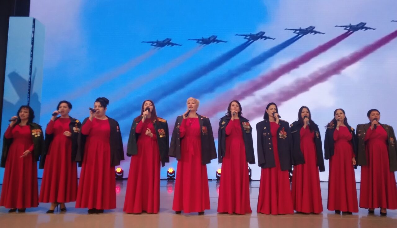 На сцену пригласили участниц вокального проекта «Жёны героев». В красных концертных платьях с накинутыми на них кителями своих мужей вышли жёны и вдовы бойцов СВО. Своим творчеством они поддерживают защитников и вселяют в них уверенность, что дома их любят и ждут. При первых же словах песни зал встал и замер, кто-то не мог сдержать слёз. А хор хрупких ставропольских женщин проникновенно пел: