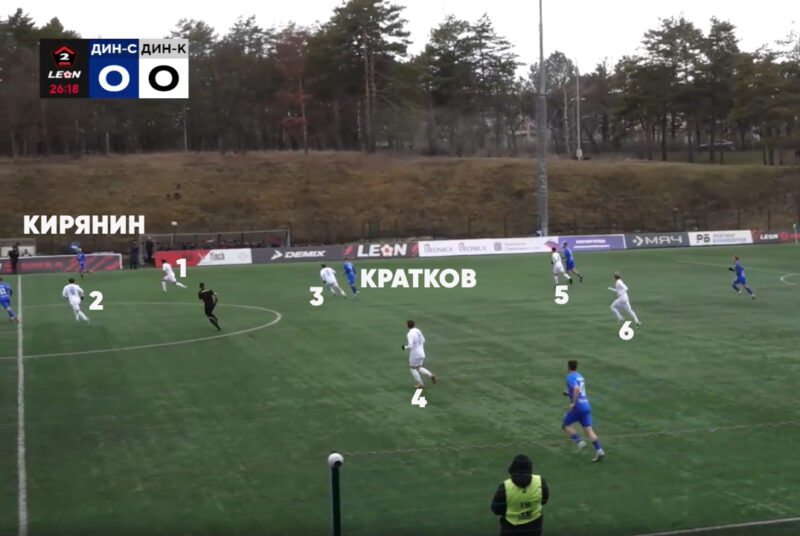 Вопросов не было, если подобная тактическая задумка работала. Ставропольские атакующие футболисты зацепились бы за мяч, получив возможность на пространстве выйти на чужие ворота три в три или два в два, к примеру. Но ведь кировские защитники раз за разом выигрывали подбор. Либо же спортивный снаряд отправлялся в единоборства. То есть никакой атаки не получалось у «сине-бело-золотых». Однако не всегда они использовали такой билд-ап. Так, на 27-й минуте встречи отлично в центре поля между линиями открылся Дмитрий Кратков. И такой выход из обороны наигрывался, потому что буквально сразу по правому флангу вперёд пошёл номинальный правый защитник Кирилл Кирянин. И вот в две передачи ставропольские футболисты отрезали сразу шестерых игроков соперника! Развить успех дальше не получилось, но кировчане моментально оказались в низком блоке.