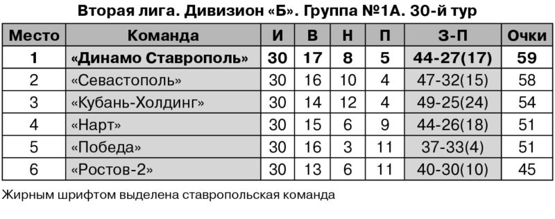 «Динамовцы» после очередного успеха вернулись на первую строчку в турнирной таблице, так как их прямые конкуренты за титул «Севастополь» и «Кубань Холдинг» в очном поединке в Краснодарском крае сыграли нулевую ничью. Теперь «сине-бело-золотым» предстоит выездное турне в виде двух матчей. 18 октября они сыграют против «Ростов-2», а 25 числа этого месяца отправятся в гости к «Кубань-Холдинг». Первого же ноября «динамовцы» на своём поле примут «Севастополь». Пожалуй, предстоящие три встречи будут ключевыми в борьбе за титул. В случае успеха при прочих равных ставропольцы могут получить преимущество в четыре очка над «Севастополем» и в восемь баллов над «Кубань Холдингом». За три тура до финиша подобный гандикап говорил бы о многом. Но не стоит записывать сразу три победы «Динамо». Просто ждем эти встречи.