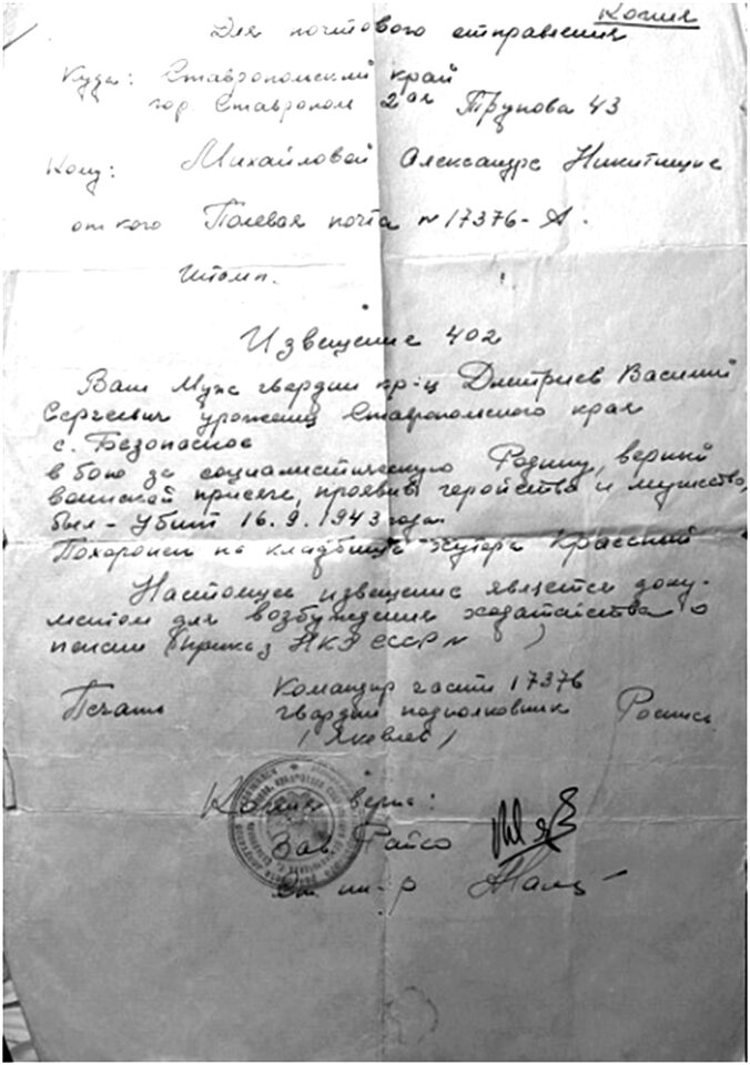 Позже жена Василия Сергеевича – Александра Никитична Михайлова получила похоронку, сообщавшую, что ее муж, гвардии красноармеец Дмитриев, верный воинской присяге, проявивший геройство и мужество, погиб в бою за социалистическую Родину.
