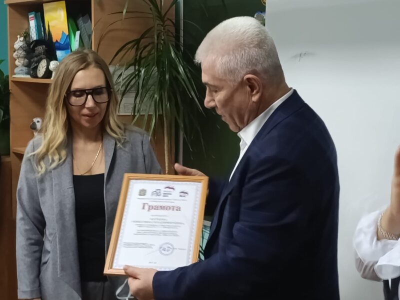 Далее координатор проекта поблагодарил директора лицея Ольгу Попцову и вручил преподавателю Анжелике Катковой грамоту за проявленную активность и новаторство в реализации проекта.