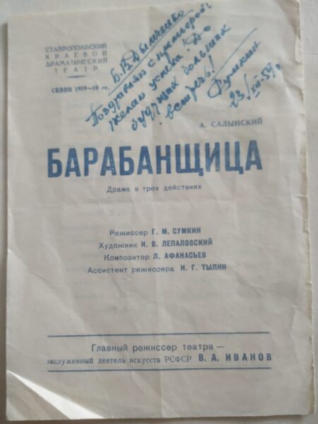 Примечательно, что накануне нынешней майской премьеры «Барабанщицы» дочь актрисы театра драмы Зинаиды Котельниковой – Варвара Сергеевна передала для архива СО СТД РФ фото и программку сезона 1959–1960 годов с личным автографом режиссера Григория Сумкина с пожеланием успехов актеру Борису Дымченко, сыгравшему в «Барабанщице» роль Федора.