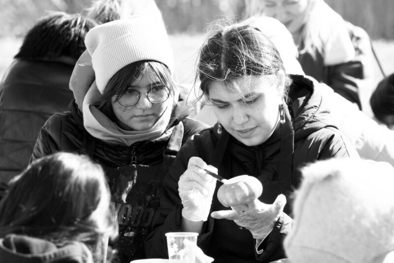 Рядом на другой локации от студии «Русские традиции» детки усердно расписывали тарелочки и гладкие камушки акрилом. Пейзажи выбирали сами по тематике фестиваля. И здесь тоже побывала сотня человек. Неподалеку кипела роспись подсвечников из гипса в скифском стиле.
