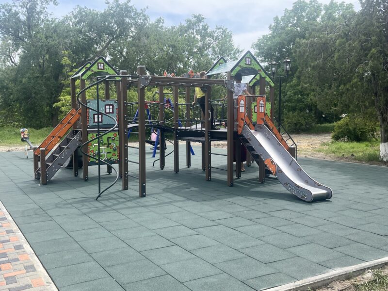 На объекте установили игровой комплекс, постелили резиновое покрытие для безопасности малышей, смонтировали освещение, сделали тротуар.