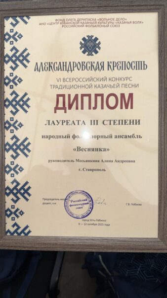 - Выступление ансамбля «Веснянка» на таком масштабном конкурсе — это не просто успех, а признание высокого уровня ставропольской школы народного творчества. Среди более чем двухсот участников только 58 прошли в финал, и наши ребята из ансамбля «Веснянка» достойно представили Ставрополь, завоевав звание лауреата III степени. Это результат таланта, труда и любви к родной культуре, — поделился глава краевой столицы Иван Ульянченко.
